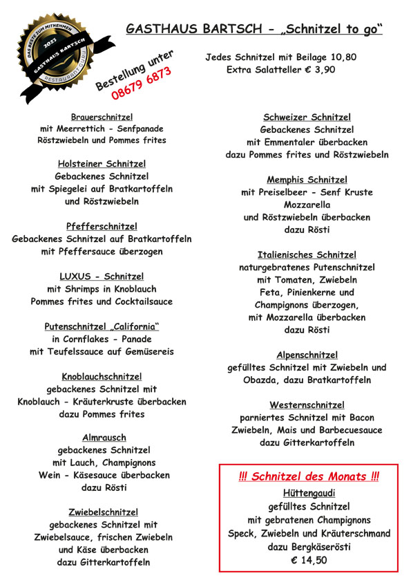 Unsere ausgewogenen Speisekarten verwöhnen vor allem mit herzhaften Spezialitäten. Zudem sorgen vegetarische Gerichte sowie der „Schnitzeldonnerstag“ für eine aufregende kulinarische Vielfalt.