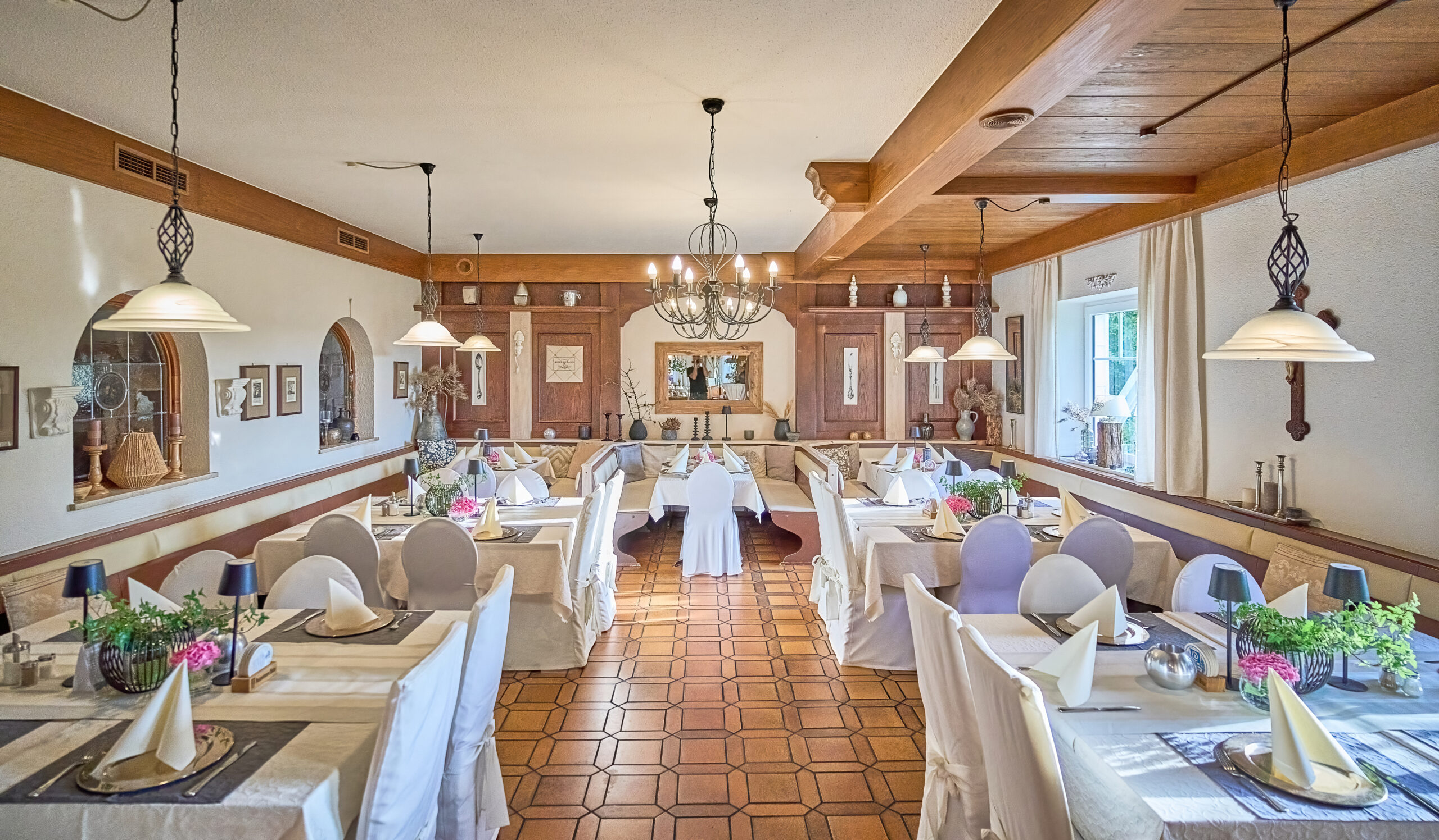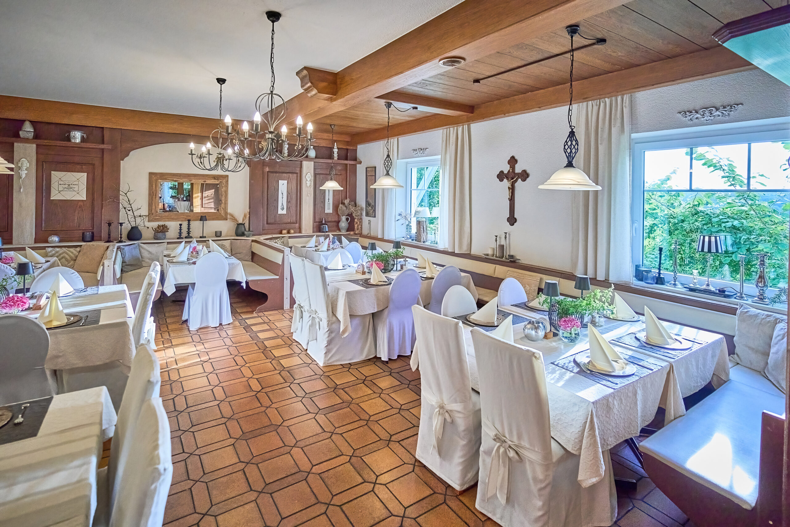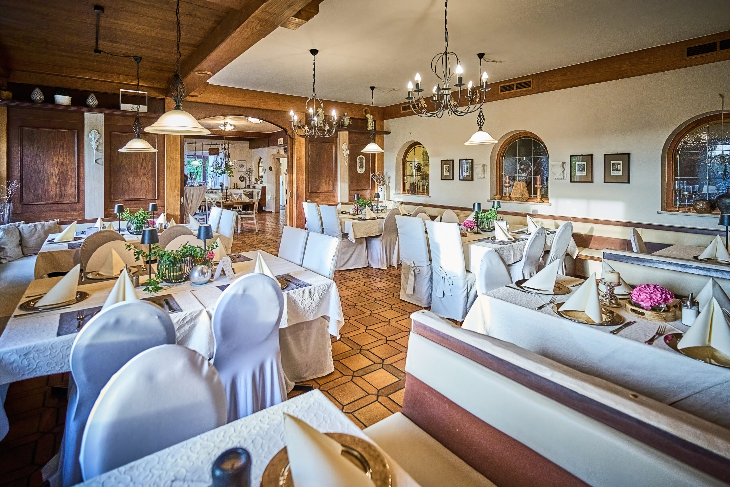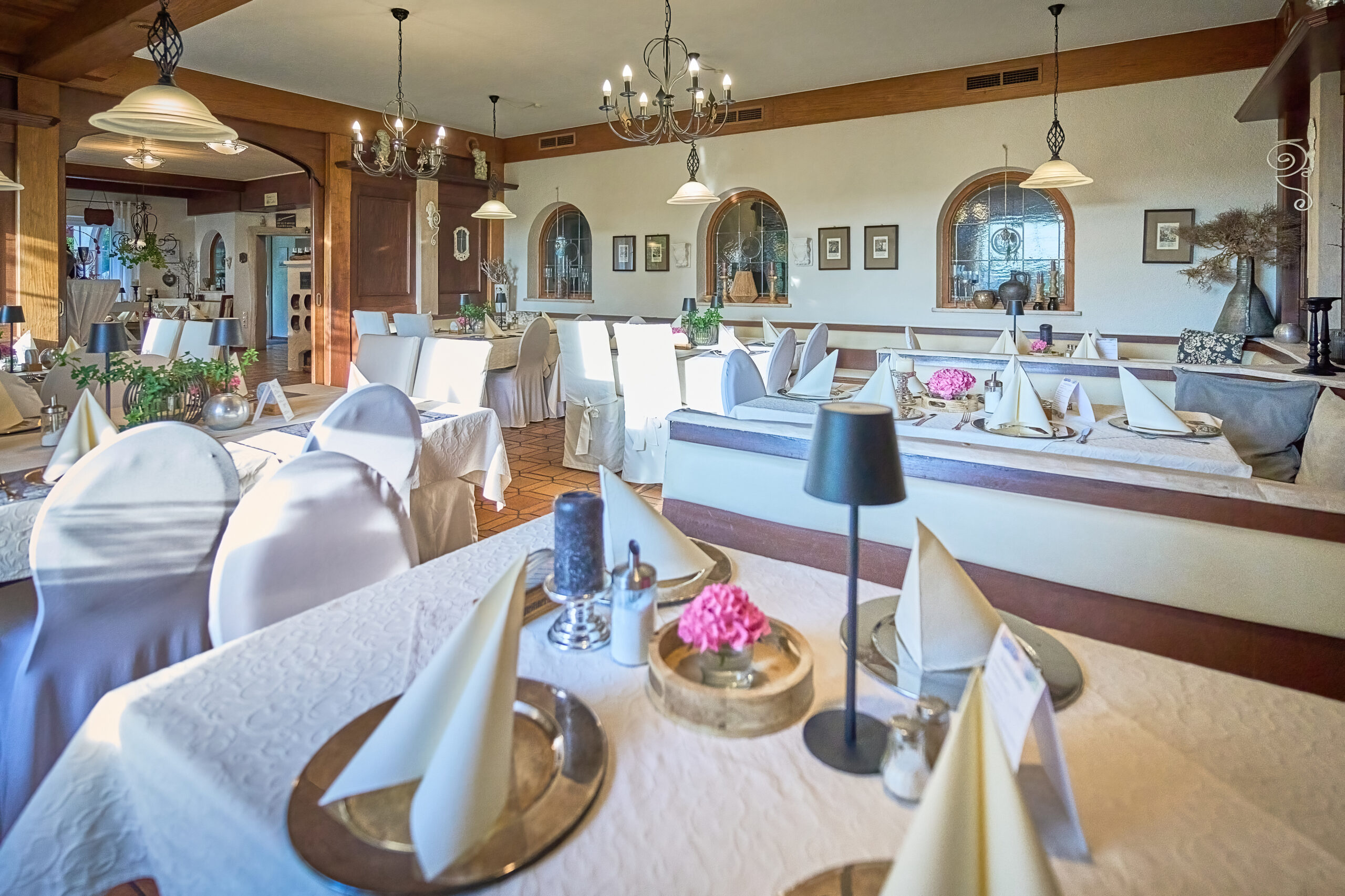 festlicher Raum. Eignet sich für größere Feiern, durch eine Schiebetür auf Wunsch abtrennbar von der Gaststube.